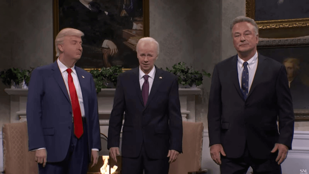 इस सप्ताह के सैटरडे नाइट लाइव कोल्ड ओपन (एसएनएल) के दौरान जेम्स ऑस्टिन जॉनसन डोनाल्ड ट्रम्प के रूप में, डाना कार्वे जो बिडेन के रूप में, और एलेक बाल्डविन रॉबर्ट एफ कैनेडी जूनियर के रूप में।