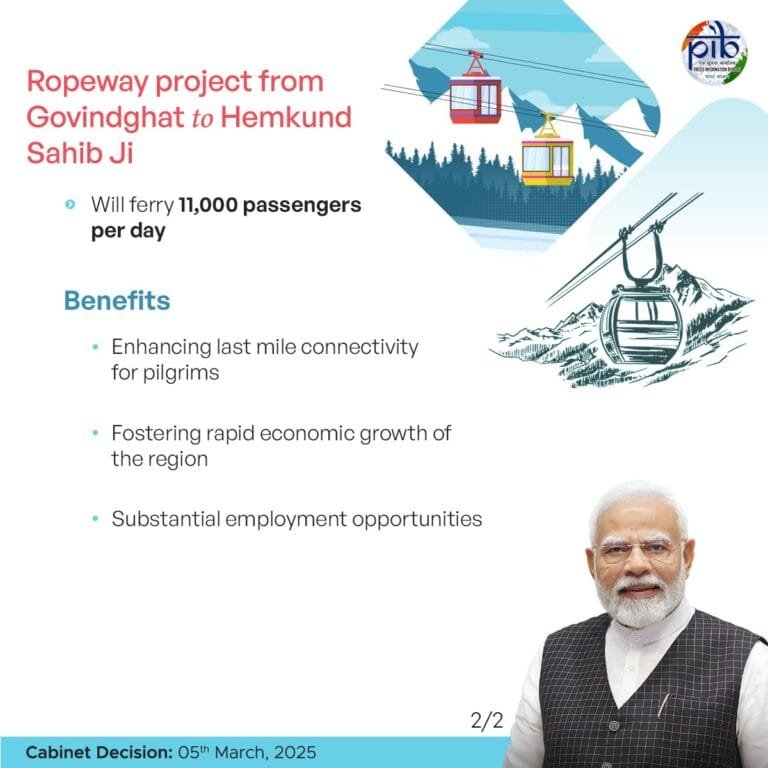 कैबिनेट ने राष्ट्रीय रोपवे विकास कार्यक्रम पर्वतमाला परियोजना के तहत उत्तराखंड राज्य में गोविंदघाट से हेमकुंड साहिब जी (12.4 किमी) तक रोपवे परियोजना के विकास को भी मंजूरी दी। प्रधानमंत्री नरेन्द्र मोदी की अध्यक्षता में आर्थिक मामलों की मंत्रिमंडलीय समिति (सीसीईए) ने गोविंदघाट से हेमकुंड साहिब जी तक 12.4 किलोमीटर रोपवे परियोजना के निर्माण को मंजूरी दे दी है। इस परियोजना को डिजाइन, निर्माण, वित्त, संचालन और हस्तांतरण (डीबीएफओटी) मोड पर विकसित किया जाएगा, जिसकी कुल पूंजीगत लागत 2,730.13 करोड़ रुपये होगी।