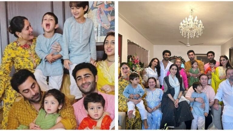 पहली तस्वीर में कपूर परिवार एक साथ ग्रुप पोट्रेट के लिए इकट्ठा हुआ है। रणबीर रणधीर कपूर के पीछे खड़े हैं और राहा को पकड़े हुए हैं। वहीं करीना बाईं ओर बैठी हैं और जेह को गोद में लिए हुए हैं।